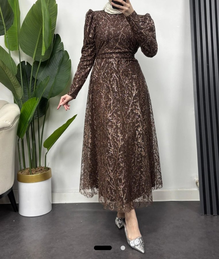 simli dantel Detaylı Kahverengi Uzun abiye teseddür elbise