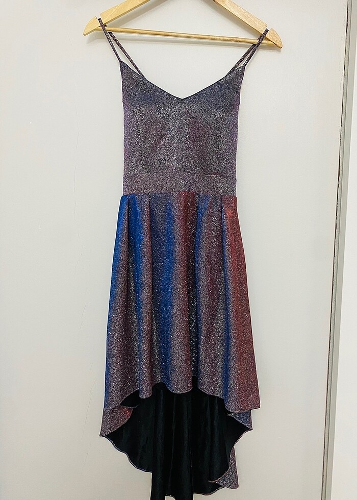 Önü kısa arkası uzun, ip askılı elbise. Sırtı çapraz geliyor. Daha kısa isteyen kısalttırabilir. Karışmaz ütü gerektirmez. Deformasyon yoktur.
