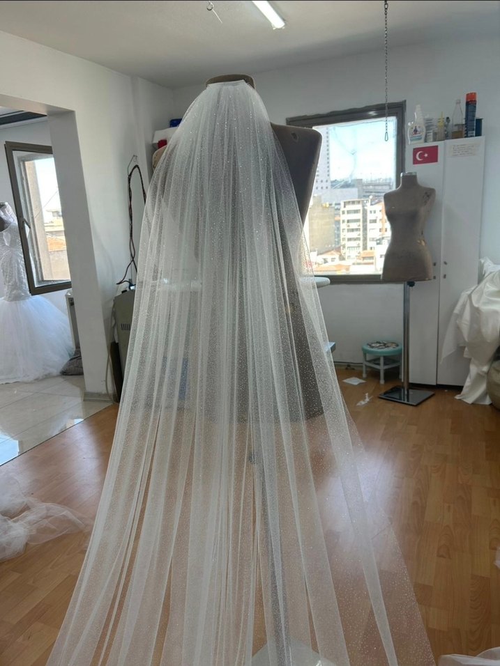 2 metre uzunluğunda kırık beyaz simli gelin duvağı hiç kullanılmadı sıfır ürün