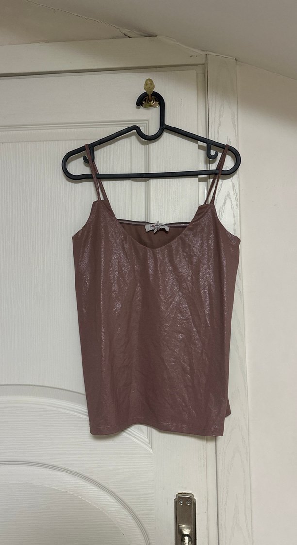 Simli Görünümlü Parlak Pembe Askılı Bluz