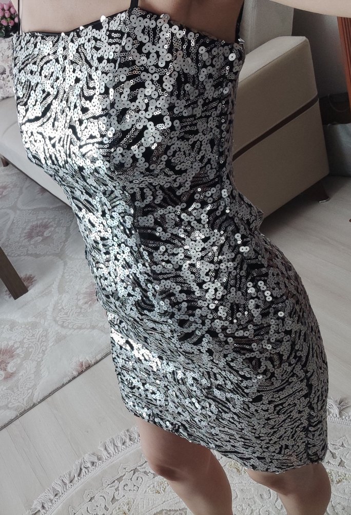 Simli pullarla süslenmiş gri yılan desenli, straplez ve vücuda oturan midi elbise. Modern çizgileri ve askılı detaylarıyla parti için uygun.