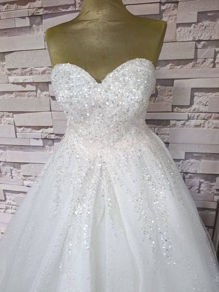 Beyaz askısız gelinlik, ust kısmı ve ışıltılı işlemelerle süslenmiş A kesim uzun etek tasarımıyla dikkat çekiyor. 36/38 bedene uygun sırtı ipli gelinlik