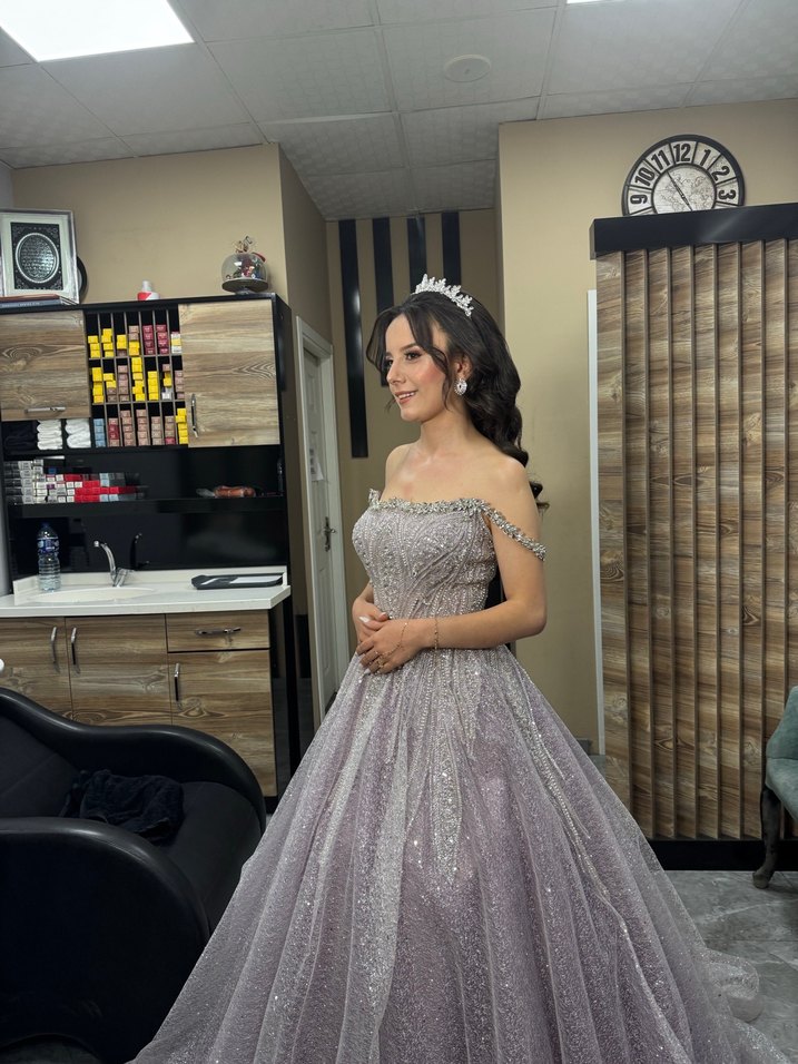 Bu mor straplez nişan elbisesi simli detaylar ve ince işlemeler içerir. Kolsuz, regular fit ve modern klasik tarzda, ışıltılı ve şık bir görünüm sunar.