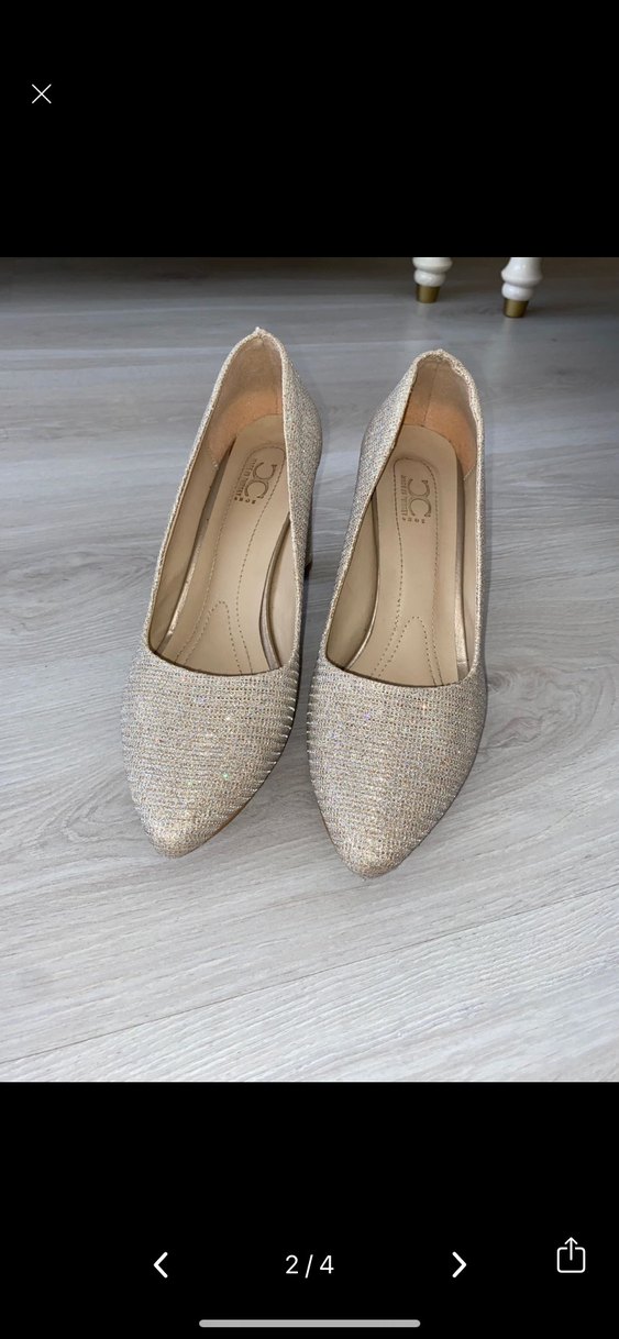Bej simli, blok topuklu kadın abiye ayakkabısı.