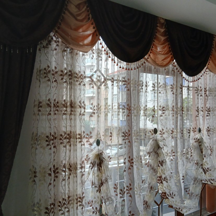 (ÖZEL DİKİM) İKİ CAMLIK. Taşınma sonucu satılıktır. isteyene 1 camlık resimde gördüğünüz gibi tül perde de verilecektir. Kendinden desenli kahverengi simli fon perde, zarif ve klasik bir görünüm sunar. Bir kere yıkandı yeniden fark yoktur. Temiz iki camlık. 4,adet perde 2,adet farbelası . ölçüleri, Perde üst, düğmeli yerden ölçümü 90 cm. Etek genişliği 2,50 cm Perde boyu, 2, 60 cm Ön farbelası genişliği 3,90 cm iki adet. farbelası boy en uzun yeri 90 cm.