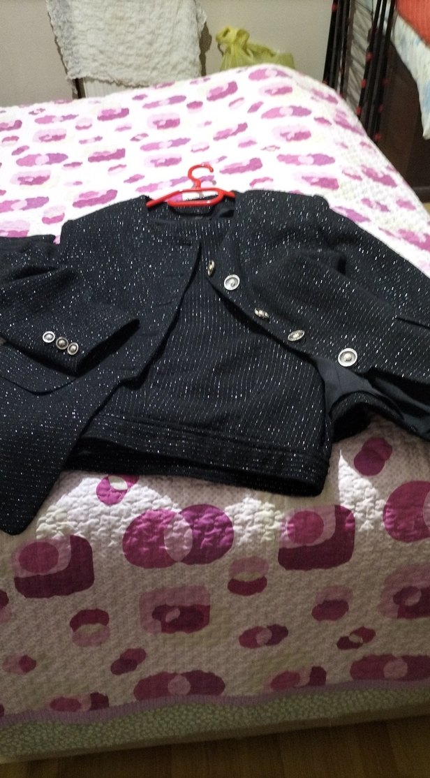 Düğmeli ön kısmı ve uzun kollu, kısa kesim siyah kadın takımıdır. Yaka tipi çentikli ve desen içermeyen kumaştan, ofis için uygundur.