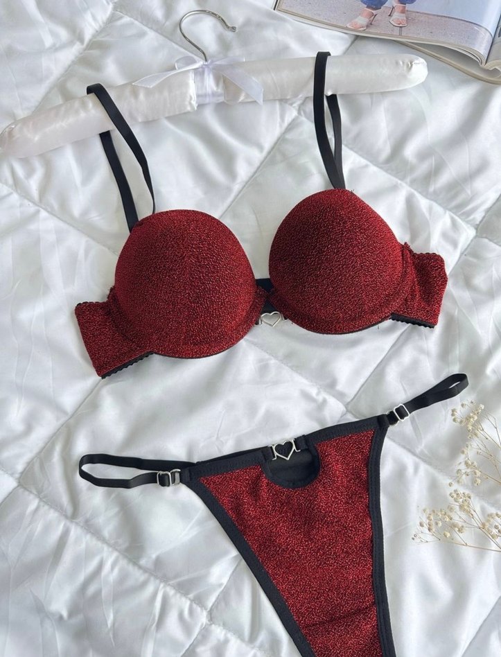 Simli Kırmızı Push Up Destekli Sütyen+Tanga
