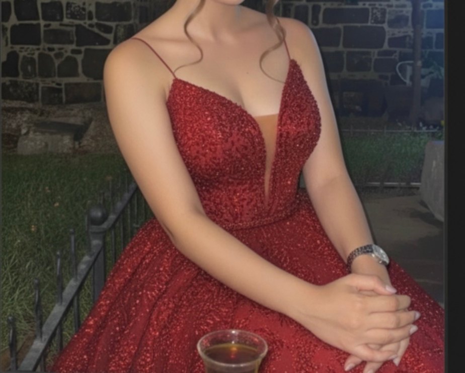 Simli Kırmızı V Yakalı İnce Askılı Abiye