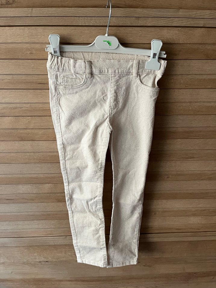 bej renkli, keten kumaştan yapılmış çocuk pantolonu. Sokak stiline uygun, trend bir görünüm sunar.