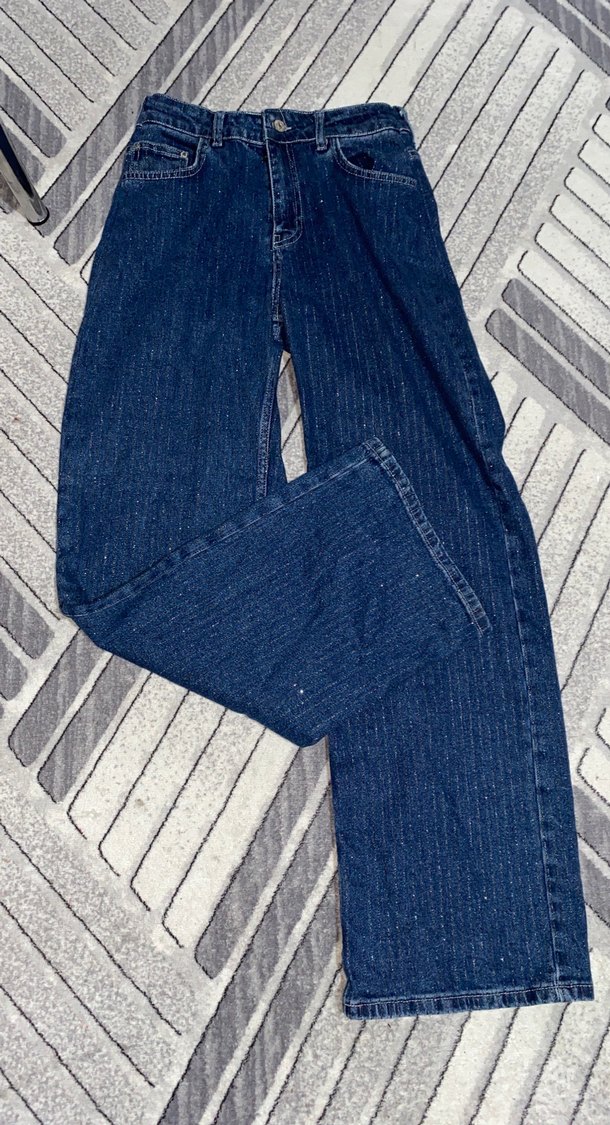 Lacivert kot pantolon, gri çizgili ve pilili detaylara sahip, rahat kesim ve midi boyda, günlük sokak stili için uygun.