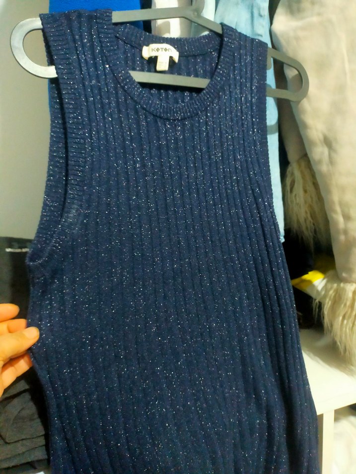 Parlak dokulu, simli lacivert bluz, kolsuz ve bisiklet yaka kesimiyle günlük rahat sokak stiline uygundur.