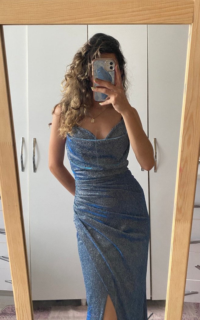 Simli mavi hologramlı kumaş, degaje yaka, anvelop etekli askılı arkası korse model bağlamalı uzun kuyruklu abiye elbise. Ablamın düğünü için almıştım, haliyle bir kez giyildi. Simleri çok dökülüyor ve yapışıyor bilginiz olsun. Ama partiler için süper olur eteği kısaltılabilir. Ekstra uzun eldivenleri de mevcuttur.