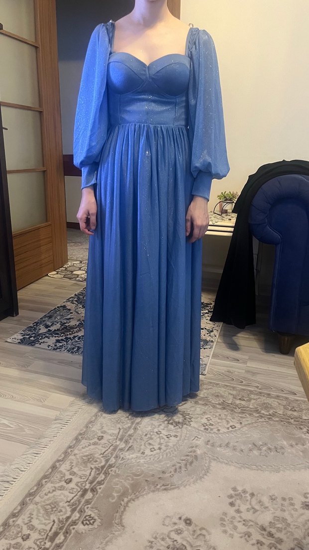 Parlak mavi renkte, tek renkli, uzun kollu ve salaş kesimli, tekne yaka bohem düğün elbisesi. 45 kiloya olur biraz üst tarafı dar bir elbise 155 boyda 45 kiloda giyildi