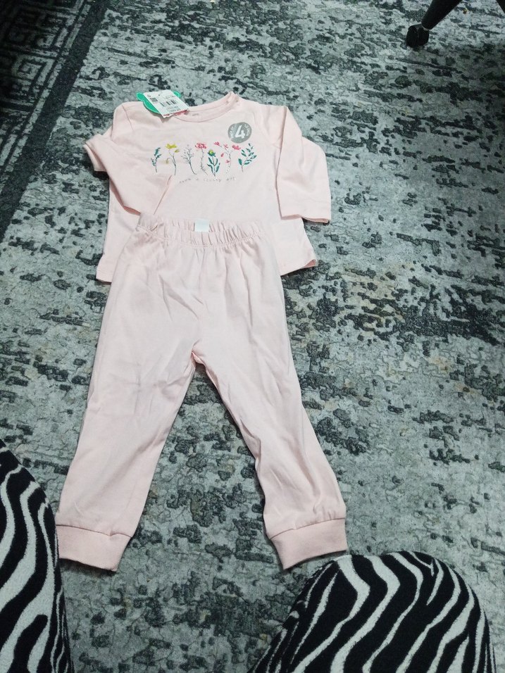 Pastel pembe renkli, uzun kollu üst ve pantolondan oluşan bebek kız takımı. Üstü simli nakışlı detaylı ve çiçek işlemelidir.