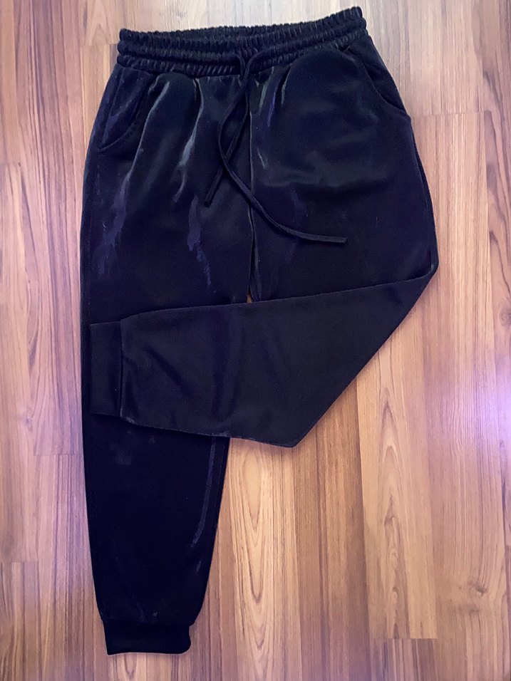 Siyah, simli parlak kumaş, bol kesim (havuç tarzında) bel kemerli, kadın eşofman altı.