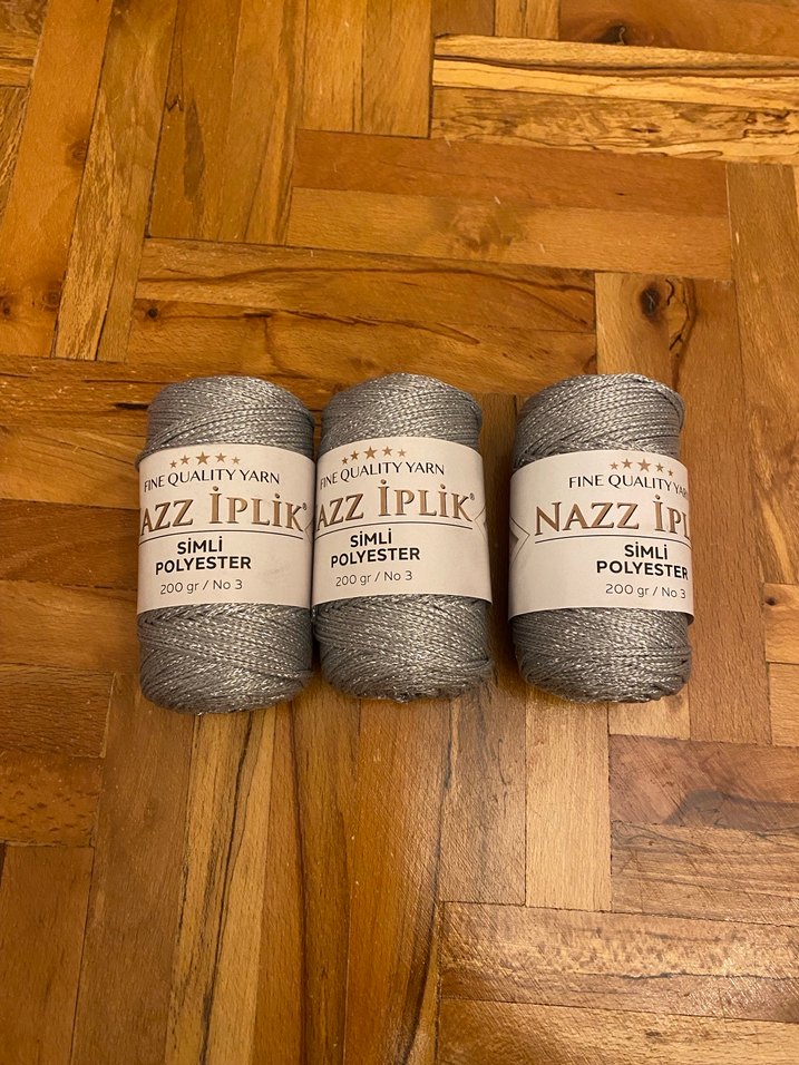 Simli polyesterden yapılmış, 200 gram ağırlığında Nazz İplik marka iplik. El işi ve hobiler için uygundur. ✨ Makrome çanta supla paspas yapımına uygun Tanesi 120 3 tanesi 300 tldir