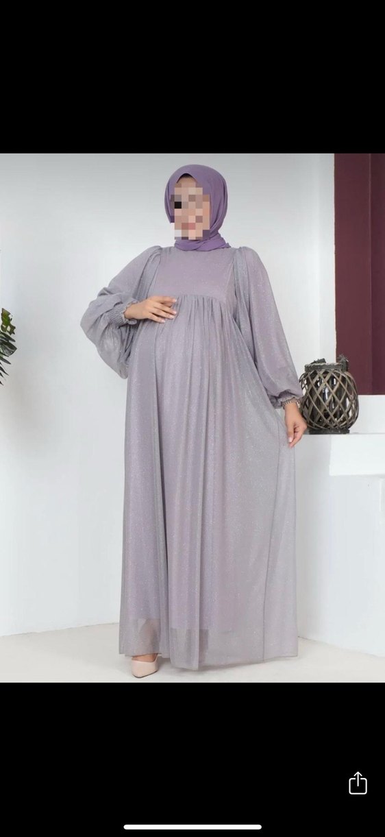 Gri renkte, uzun, salaş kesimli, drapeli detaylara sahip, uzun kollu kadın elbisesi. Yumuşak sentetik kumaştan üretilmiştir. Hiç giyilmedi Giyilmek üzere 1 kez yıkandı ve ütülendi ancak organizasyona katılınamadı ve sonrasında da giyilmedi Resimlerde de görüldüğü üzere hafif lilaya çalan bir gridir