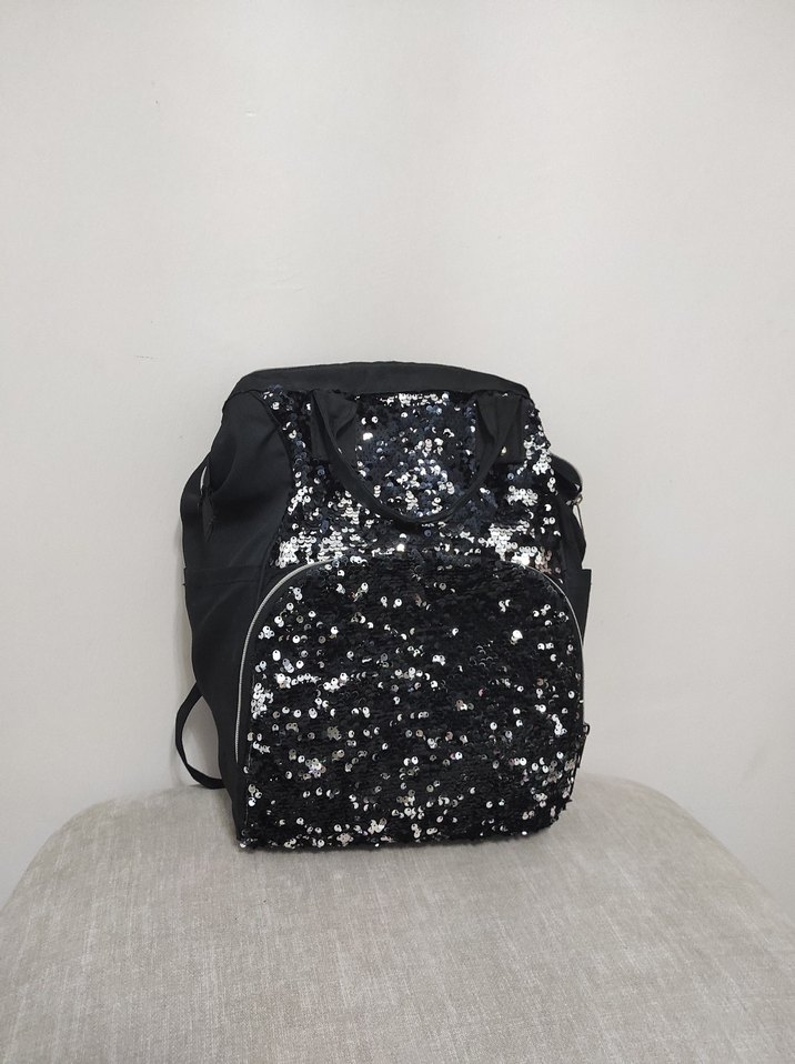14 adet alan vardır.Simli detaylara sahip siyah kadın sırt çantası, sentetik kumaştan yapılmıştır. Gotik ve gösterişli tarzıyla trend belirleyicilere uygundur. ✨