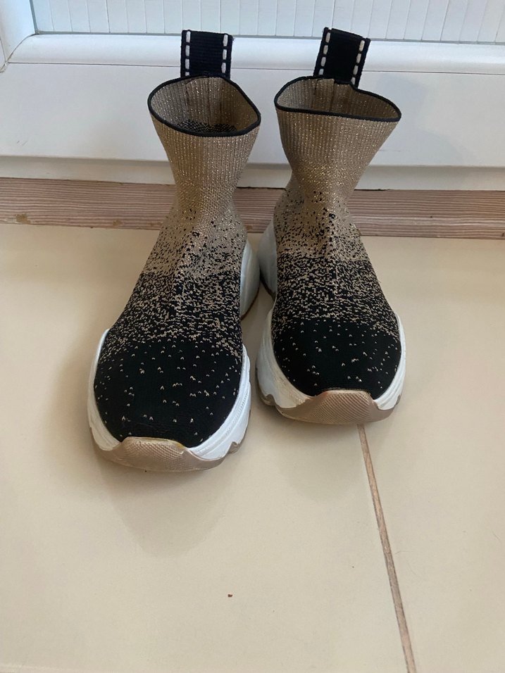 Kadın spor ayakkabısı, simli siyah bej triko üst ve platform kauçuk topuk ile günlük kullanım için modern ve rahat bir tasarıma sahiptir.
