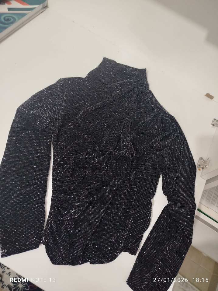 Simli sentetik kumaştan, balıkçı yaka ve uzun kollu, siyah renkli, dar kesim kısa bluz. Avant-garde sokak stili ve partiler için uygun. ✨sadece bir kere giyildi
