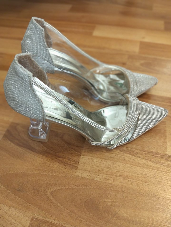 Cam detaylı, simli bej stiletto topuklu kadın ayakkabı. Düğünler için çağdaş ve şık bir görünüm sunar. Parlak ve desensiz tasarıma sahip. YALNIZ 1 kere giyildi