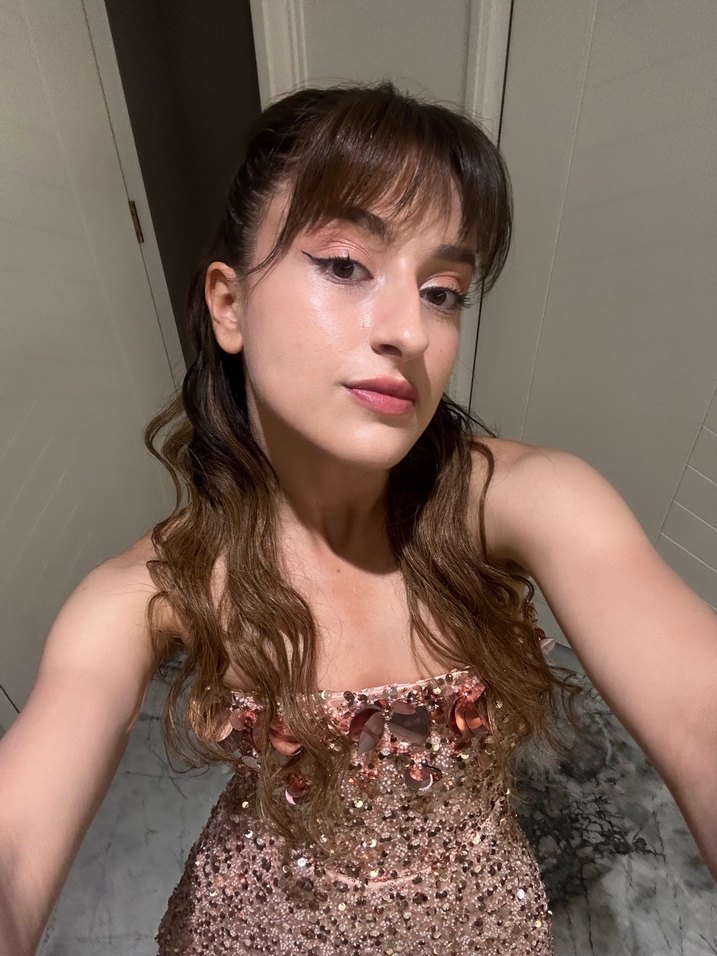 Simli, straplez kesim ve askılı kolları olan bu dar kesim midi abiye, parlak batik deseniyle dikkat çekiyor. ✨
