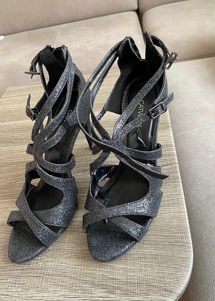 Simli abiye topuklu ayakkabı. 9cm topuk .1 kere giydim fakat içinde ki taban soyulmuş foto da ekledim zaten .