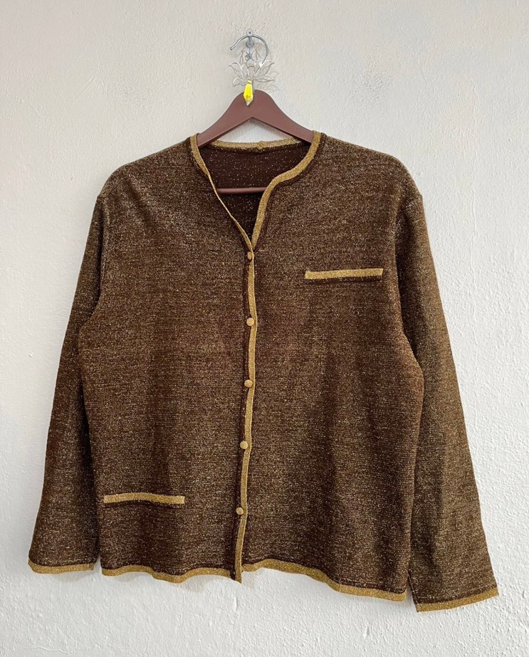 Kahverengi simli triko hırka, uzun kollu ve düğmeli. Notlu yaka ve bol kesim ile parıltılı, bohem tarzda, günlük kullanım için uygun. ✨ İki kol altı 52 cm, uzunluk 56 cm. Sadece bir kez giyilmiş, yıkanıp kaldırılmıştır. Sıfır ayarında. Lütfen açıklama ve resimlere göre değerlendiriniz, iade kabul edemiyorum.