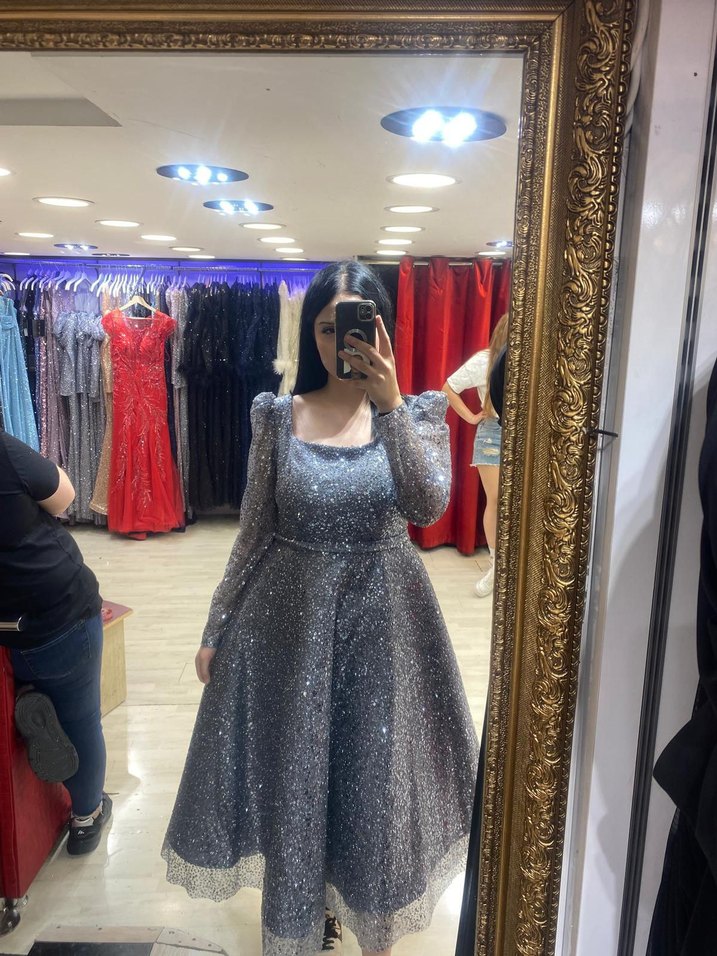 Simli kumaştan yapılmış, uzun kollu, tek renk gri abiye elbisedir. Tekne yaka ve klasik şık duruşu ile düğünler için uygundur. ✨ sadece bir kez giyildi