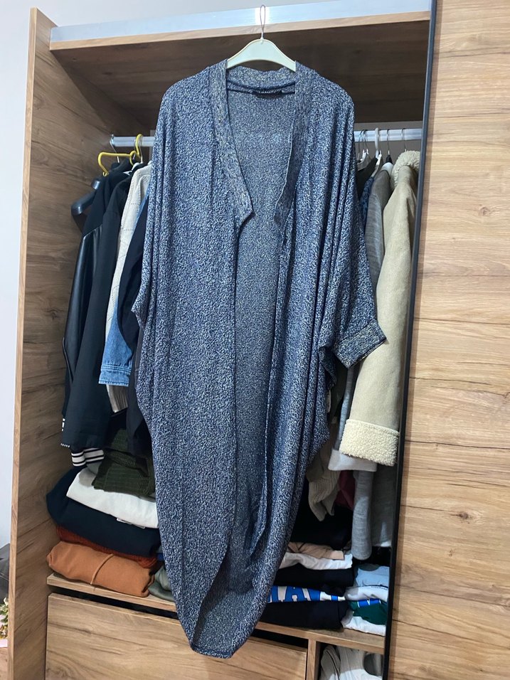 Simli, uzun boylu, salaş kesim ve dökümlü tasarıma sahip kadın hırka. Keten kumaştan, uzun kollu ve yakası kesik detaylı, günlük kullanıma uygun.