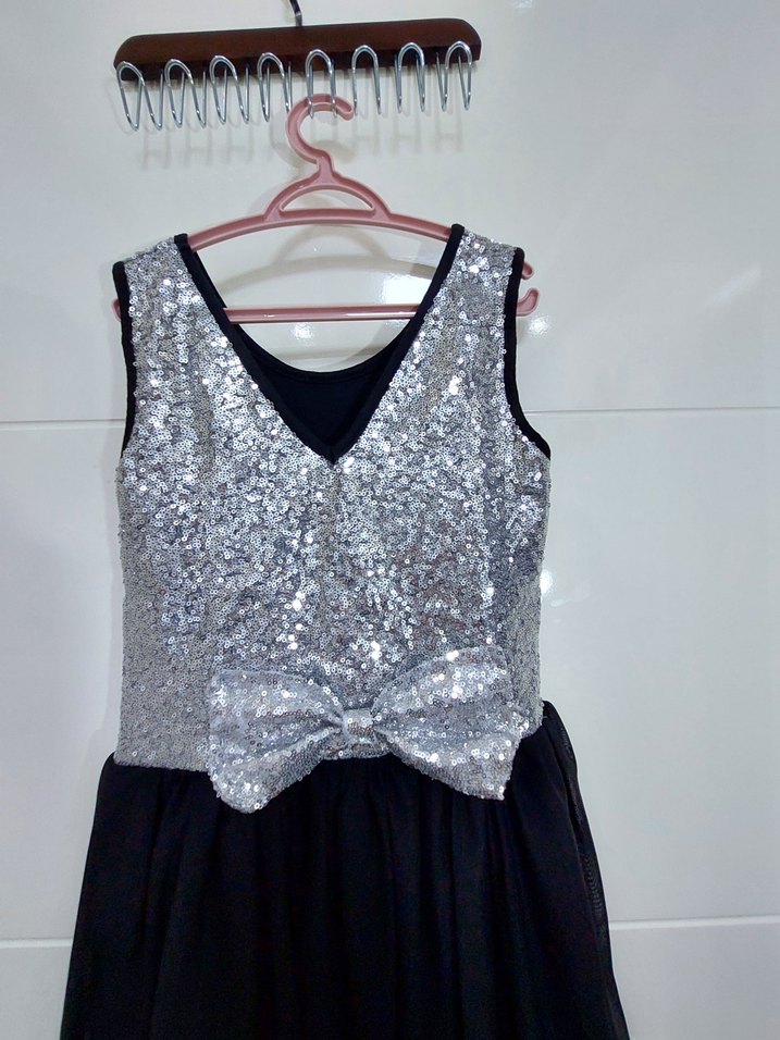 V yaka, kolsuz, simli sentetik kumaştan yapılmış, fitted kesim gri kız elbisesi. Büyük fiyonk detayıyla gotik ve avangart tarzı yansıtıyor. ✨