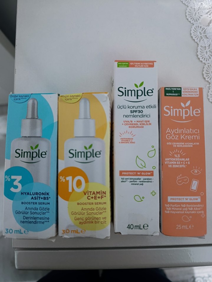 Simple cilt bakım seti; %3 hyaluronik asit serum, %10 vitamin C+E+F serum, SPF30 nemlendirici krem ve aydınlatıcı göz kremi içerir.