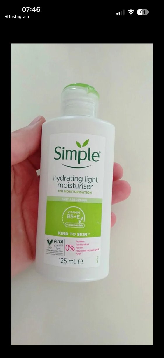 Simple nemlendirici, B5 ve E vitaminleri ile 12 saat hızlı emilen nem sağlar. Paraben ve yapay kokusuzdur, cilde naziktir.