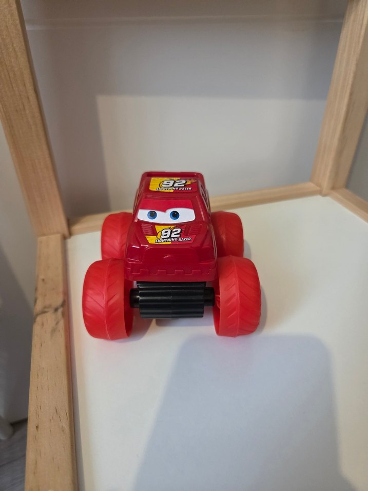 Büyük tekerlekli, 92 numaralı renkli kırmızı oyuncak araba, önünde gözlerle eğlenceli tasarıma sahip. Sürükle bırak özelliği var