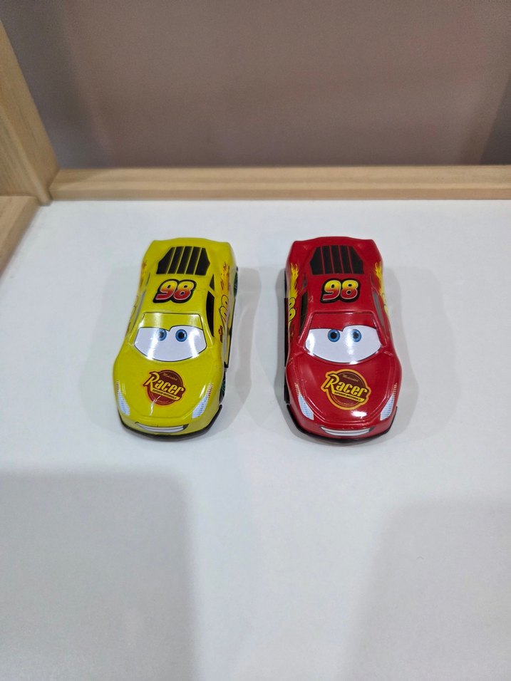 Kırmızı ve sarı renklerde, 98 numaralı, gözlü renkli yarış arabası oyuncakları seti. Hayal gücünü destekler. plastik malzemedir