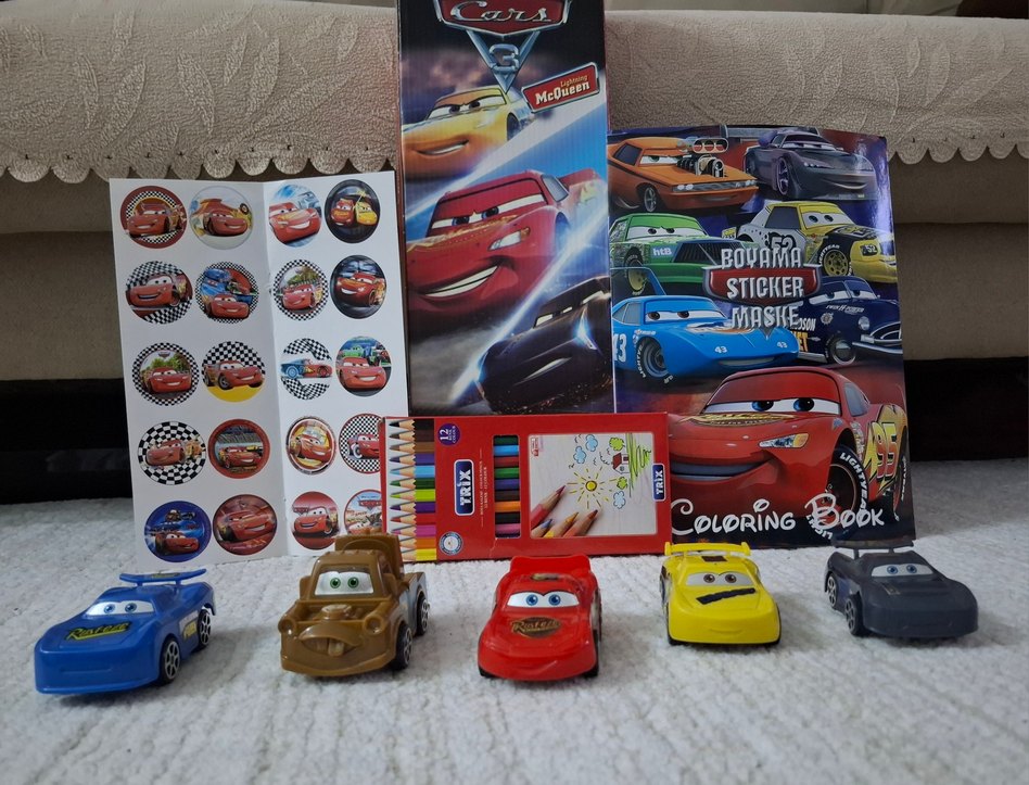 Şimşek McQueen Seti Sıfır. Hiç kullanılmadı. 5 adet araba. 16 sayfa boyama kitabı. Boyama kitabının arka kapağı Şimşek McQueen maskesi. 20 adet sticker. 12li kuru boya kalemi seti. Hepsi bir arada.