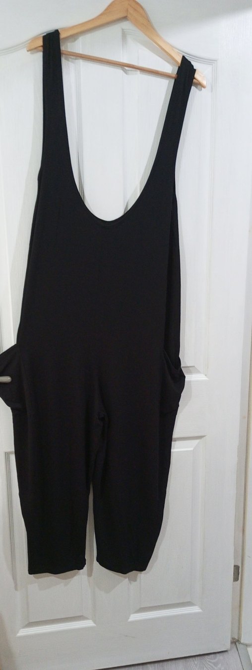 Siyah, kolsuz, salaş kesim ve yuvarlak yakalı tulum. Düz, pamuk viskon kumaştan yapılmıştır. Minimalist ve goth tarzıyla günlük kullanıma uygundur. Ürün esnek penye rahat S beden kalip son resimlerdeki gibi cepli bahçıvan model