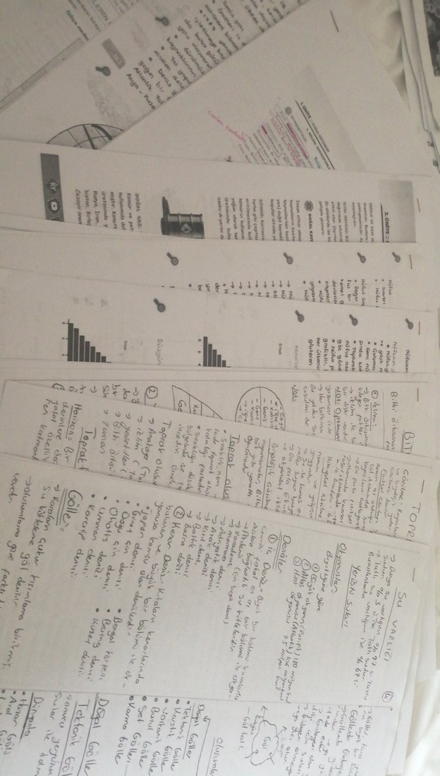 El yazısı sınav hazırlık notları ve grafiklerle desteklenmiş basılı çalışma sayfaları, önemli konuları gözden geçirmek ve soru pratiği yapmak için uygundur.