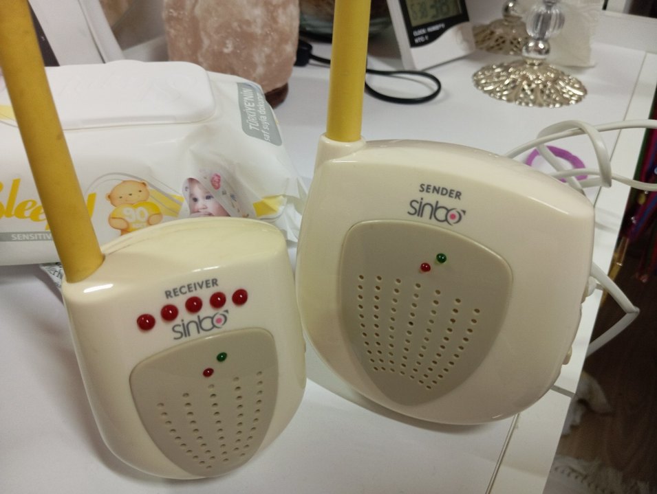 Sinbo bebek monitörü, renkli gösterge ışıklı beyaz gönderici ve alıcıdan oluşur.