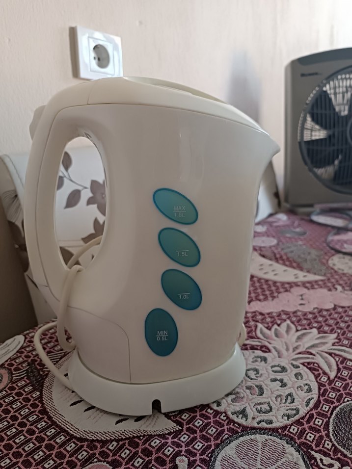 saplı ve su seviyesi göstergeli beyaz elektrikli su ısıtıcısı. Hızlı su kaynatma için uygundur. bir iki defa kullanıldı sorunsuz çalışıyor