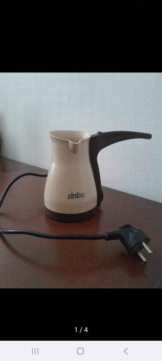 Sinbo markalı, beyaz gövde ve gri kulplu elektrikli Türk kahvesi cezvesidir. Pratik kullanım için elektrikli fişi vardır. ☕