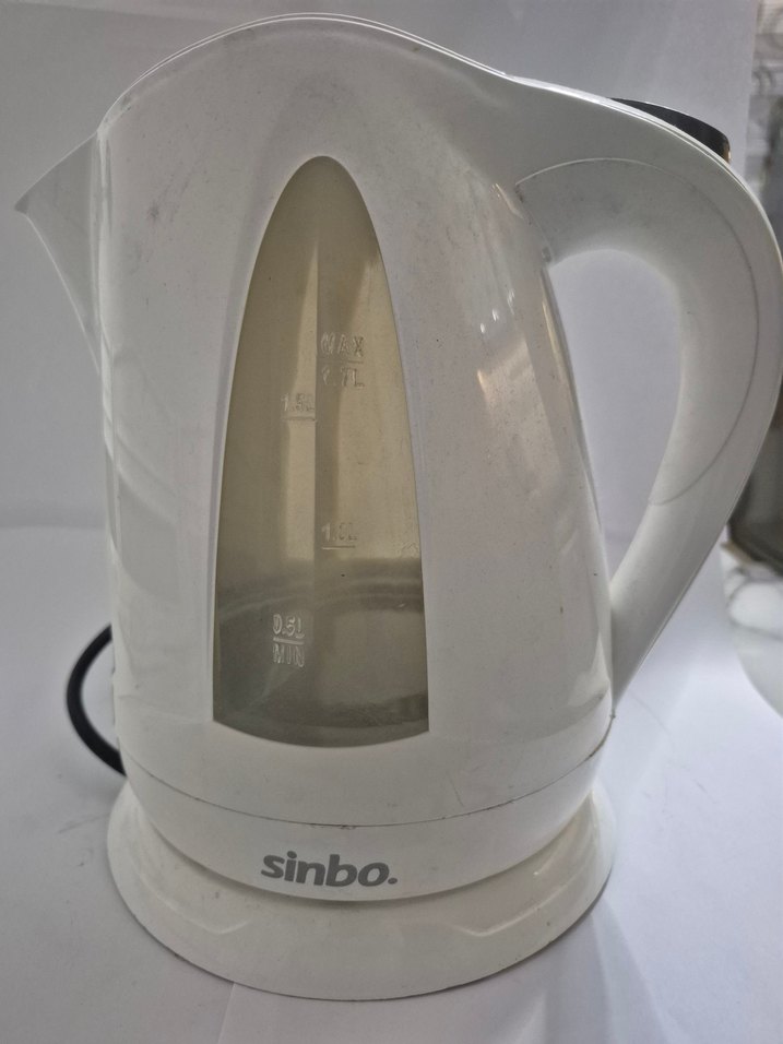 Sinbo markalı beyaz su ısıtıcısı, gri su seviyesi göstergesi ve rahat tutma sapına sahiptir. Hızlı kaynatma için uygundur. ☕