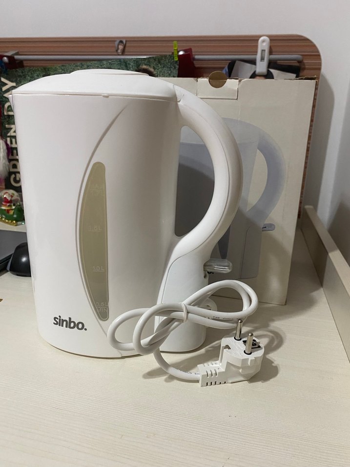 Sinbo beyaz su ısıtıcısı, su seviyesi göstergesi ve ergonomik tutma sapına sahiptir.