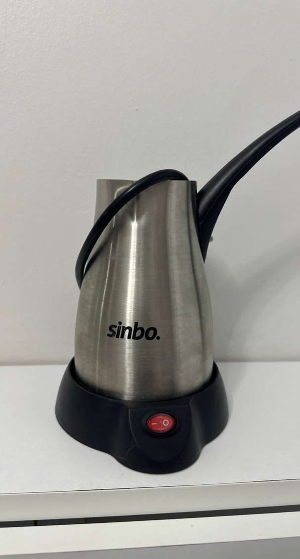 Sinbo gri renkli elektrikli kahve makinesi, paslanmaz çelik gövde ve siyah taban ile sap içerir, kolay kullanımlı açma-kapama düğmeli. ☕