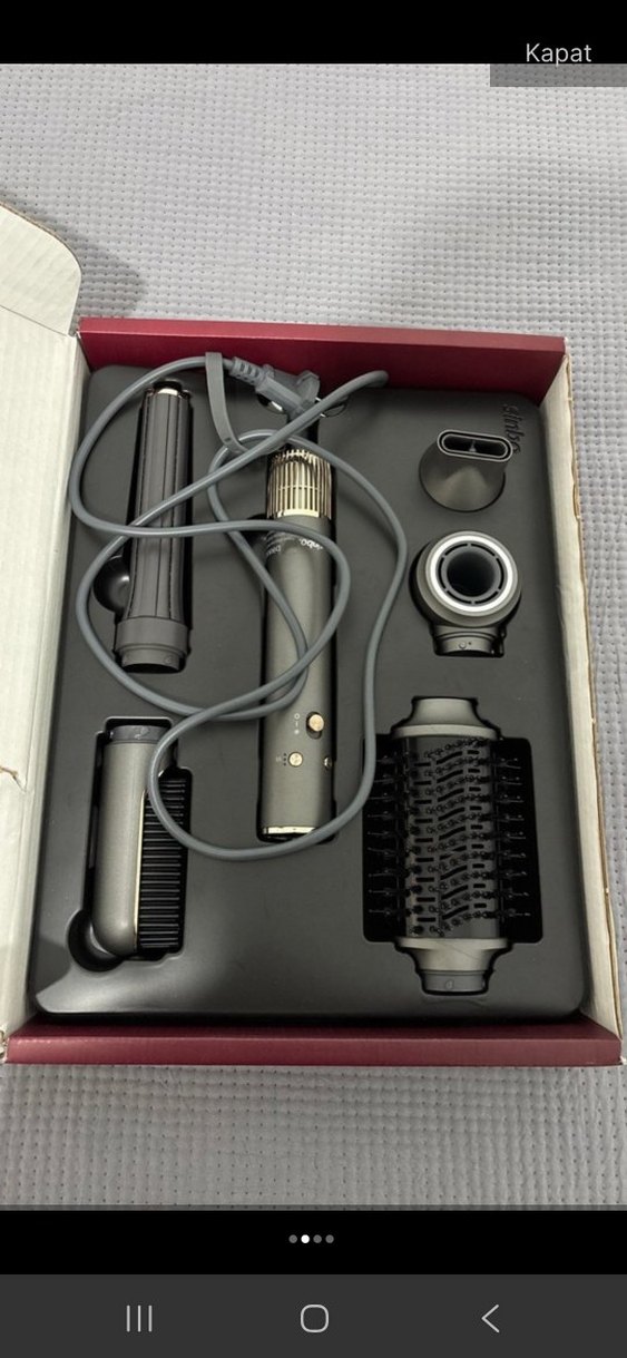 Gri saç şekillendirici seti, farklı saç stilleri için çeşitli başlıklar içerir. Ana ünite şık tasarımlı, maşa, fön ve fırça başlıklarıyla çok yönlü kullanım sağlar. ♀️