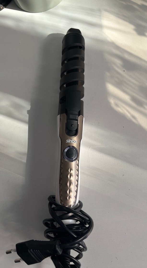 Sinbo saç şekillendirici, koyu renkli spiral varil ve ayar düğmesi ile bej renkte. Kablolu tasarımı sürekli güç sağlar.