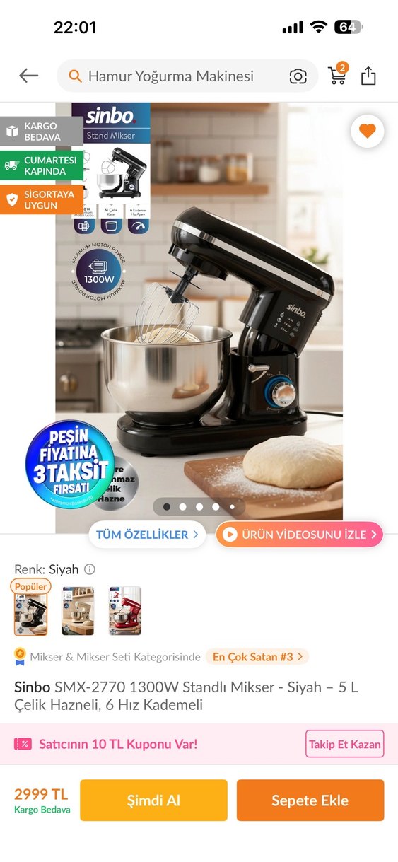 Sinbo SMX-2770 standlı mikser 1300W motor gücü, 5 litre çelik hazne ve 6 hız kademesi ile çeşitli karıştırma işlemleri için uygundur. Siyah renktedir.