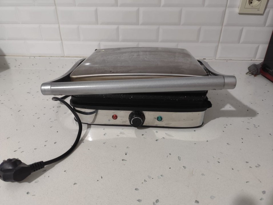 Paslanmaz çelik gövdeli gri sandviç ve tost makinesi, sıcaklık kontrol düğmesi ve gösterge ışıklarıyla kullanımı kolaydır. çalışır durumda