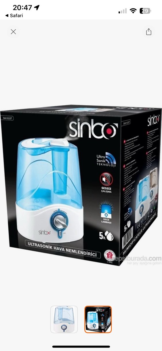Sinbo ultrasonik hava nemlendirici, 5 litrelik su tankı, sessiz çalışma ve gece lambası özelliği ile iç mekan havasını nemlendirir. Çalışıypr hiçbir sorunu yok renginde çok hafif bir farklılık olabilir fiyatta yardımcı olurum