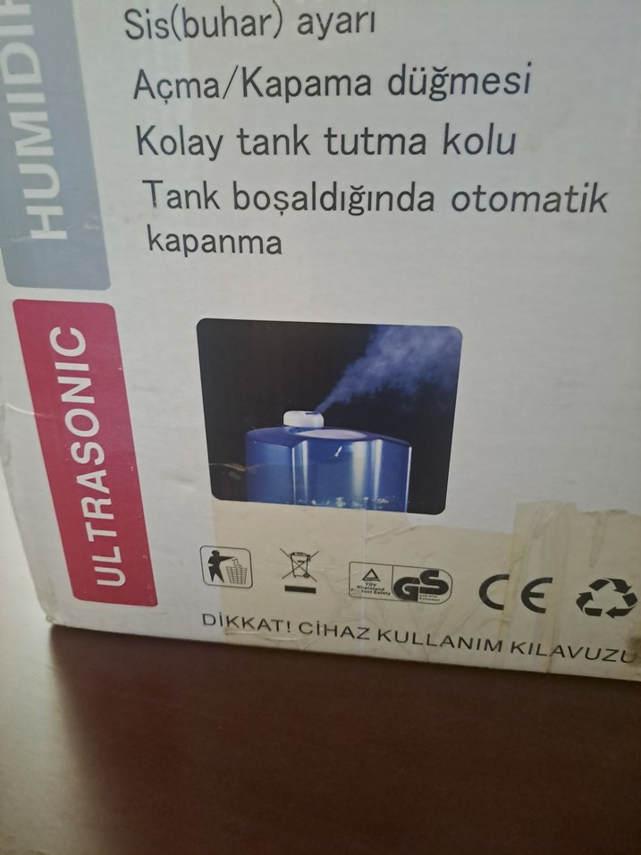 Ayarlanabilir sis ayarı, kolay tutma kolu ve tank boşaldığında otomatik kapanma özelliklerine sahip ultrasonik nemlendirici. Açma/kapama düğmeli.Çok az kullanıldı yeni gibi, bir iki kez kullanıldı